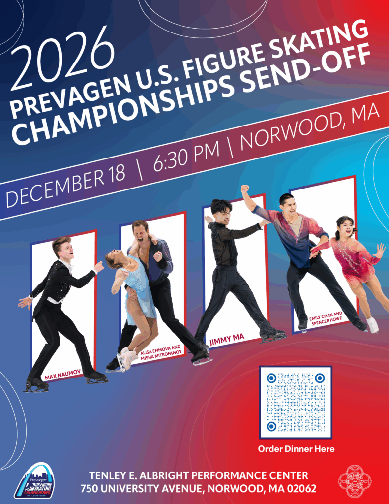Join us on Thursday, December 18th at 6:30PM for a FREE public ice show to witness some of the best skaters in the country perform as they gear up to head to the 2026 Prevagen U.S. Figure Skating Championships in St. Louis, Missouri. U.S. champions will be crowned in the women’s, men’s, pairs and ice dance disciplines at the championship and junior levels, as well as novice pairs and ice dance at the event. The U.S. Championships also will serve as the final qualifying event prior to the selection of the U.S. Olympic Figure Skating Team that will represent Team USA at the Olympic Winter Games Milano-Cortina 2026. Dinner for members will be served at 8:00PM, pre-registration required.