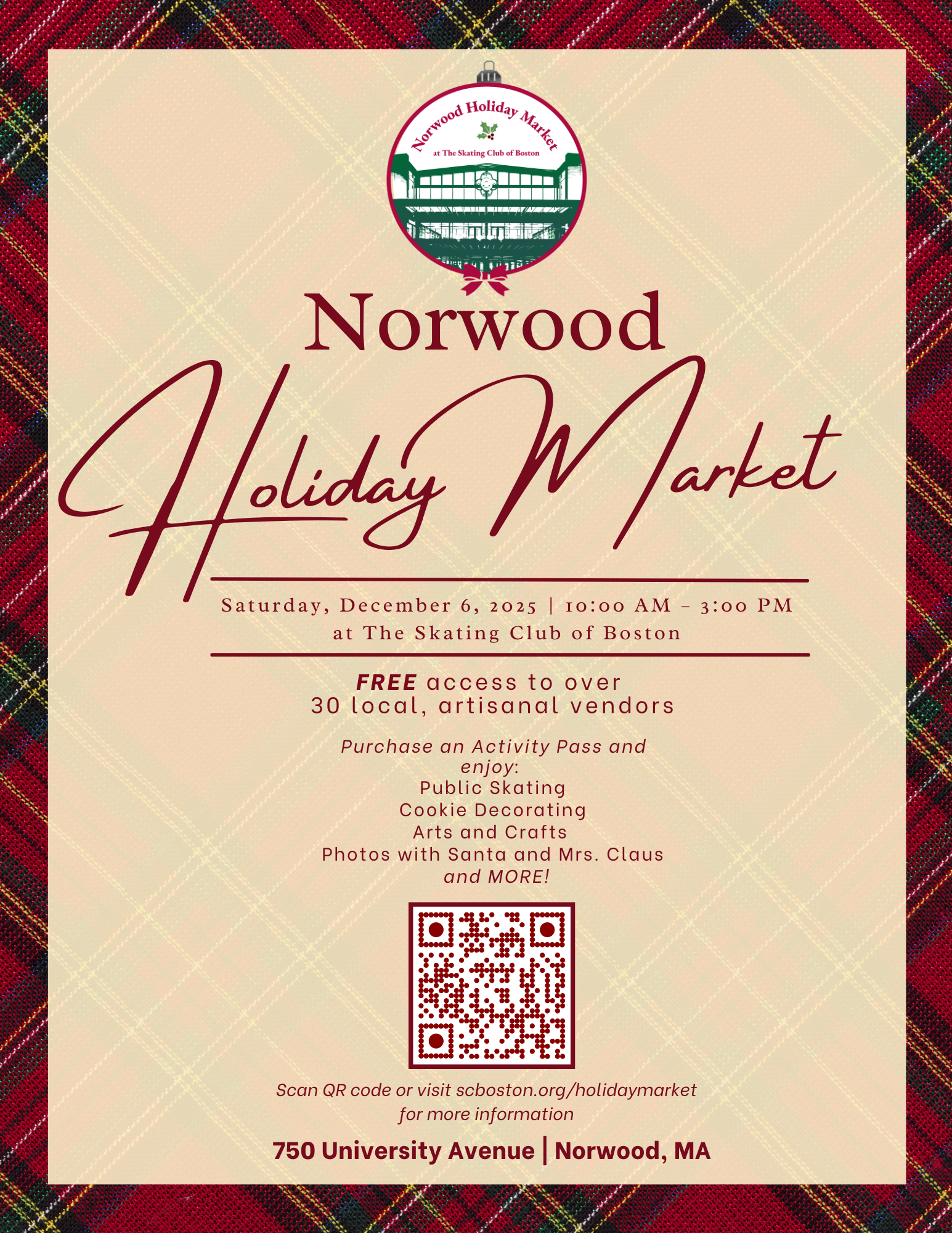 Join us on Saturday, December 6th from 10:00 AM – 3:00 PM for a day filled with fun for the whole family. Explore unique gifts from local vendors and live holiday music. Purchase an Activity Pass to enjoy public skating and the Holiday Workshop which includes, Cookie Decorating, Arts and Crafts, and Photos with Santa and Mrs. Claus from 1:00 PM – 2:30 PM. Don’t miss a cherished holiday tradition – newly imagined at The Skating Club of Boston in Norwood.